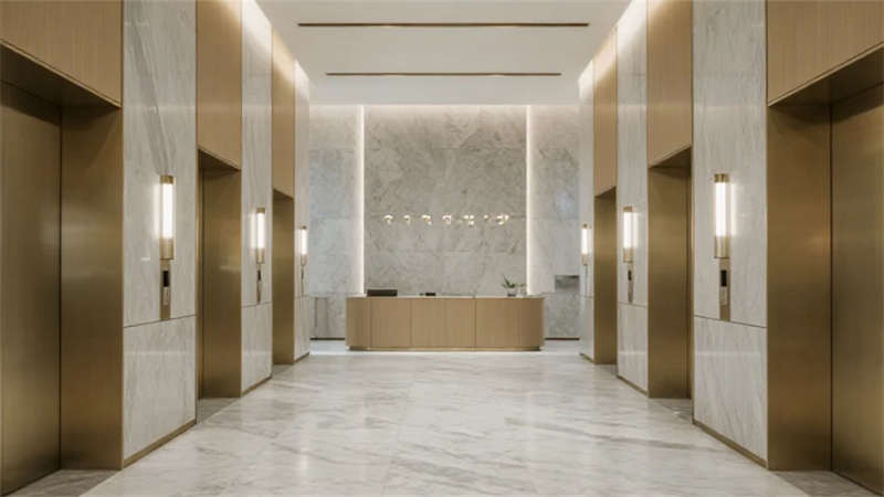 本設計以現代簡約美學重構辦公空間本質,建筑外觀采用純凈的玻璃幕墻與幾何切割形體,在晝夜交替中演繹光與影的韻律。入口大廳通過挑高空間與弧形前臺營造開放包容的儀式感,綠植墻與球形燈具的點綴賦予空間自然生機。電梯間延續極簡語言,香檳金金屬與巖板材質碰撞出低調質感。