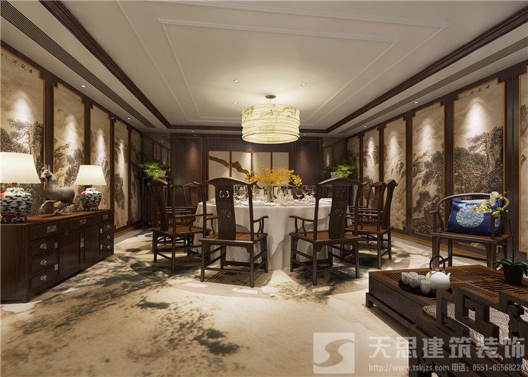 首先要考慮的是餐廳的地板、側面和天花板.餐廳的地板一般選用光滑、易清洗的材料,如大理石、花崗巖、瓷磚等.在腰部位置考慮墻體的一些防撞、耐磨材料,如選用一些木材裝飾、墻磚、做局部裝修、墻體防護處理等.屋頂應用優雅、干凈的材料裝飾,如乳膠漆、部分木器裝飾、燈具烘干等,有時吊頂可以適當地提升,能給人一種親切感.