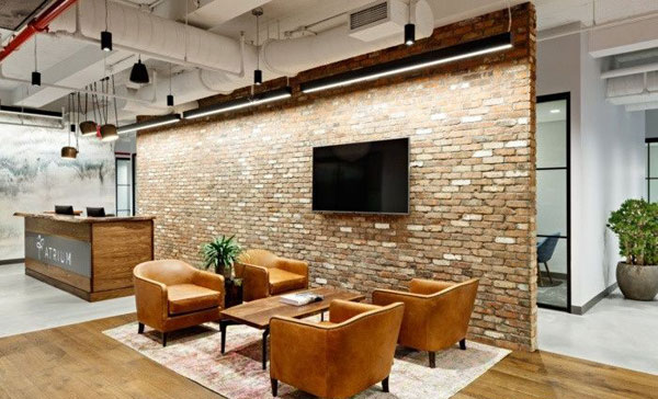 一個裸露的磚墻和水彩墻覆蓋,提供了一種溫暖的感覺。靠近接待處的是一個咖啡吧和休息室,它通向一個大型會議室。
