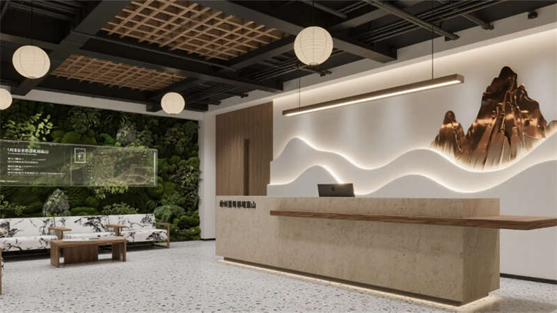 前臺大廳成為文化凝練的序章:層疊銅藝山形墻在光暈中起伏,夯土臺面與懸浮木構的碰撞隱喻傳統與未來的對話。紙膜藝術燈如空中浮云,柔化工業風的冷峻基調。