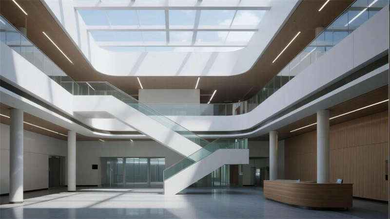 空間內核強調人性化體驗:挑高中庭以懸浮樓梯創造輕盈動線,屋頂花園成為員工觸摸自然的窗口;無柱車間與智能實驗室展現工業精密感,而木格柵連廊與綠植墻則注入人文溫度。夜幕降臨時,建筑化為光影容器,冷白光帶勾勒結構輪廓,暖黃窗格透出工作場景的活力。