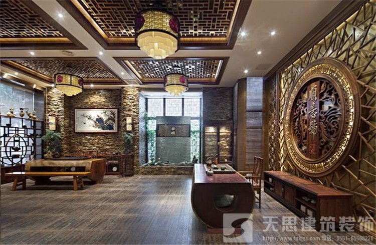 古典中式裝修茶樓會所空間裝飾有極強的設計感,高低錯落的掛畫與格柵窗落增加茶室的藝術美,原色原味的樹根茶幾集實用與欣賞一體,泡一杯清茶,就進入了一片碧綠的天空,這里將成為愛茶人士的最愛。