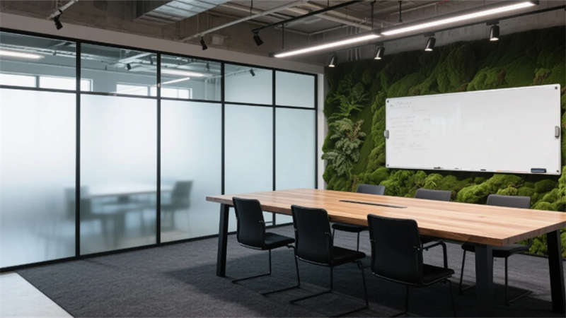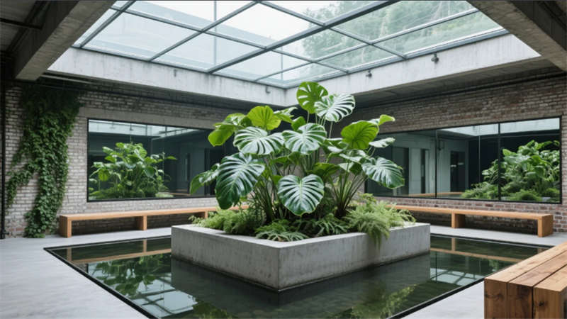 設計將機械的冷靜與自然的呼吸編織為共生語言。裸露的鋼骨結構承載生產使命,而攀附的綠植、原木肌理與暖光,則為空間注入生命脈搏。合肥堅韌務實的精神被轉化為混凝土立柱與苔蘚墻的碰撞——冷硬材質因生長而柔軟。