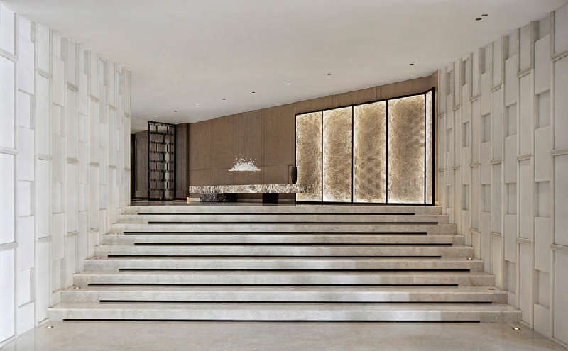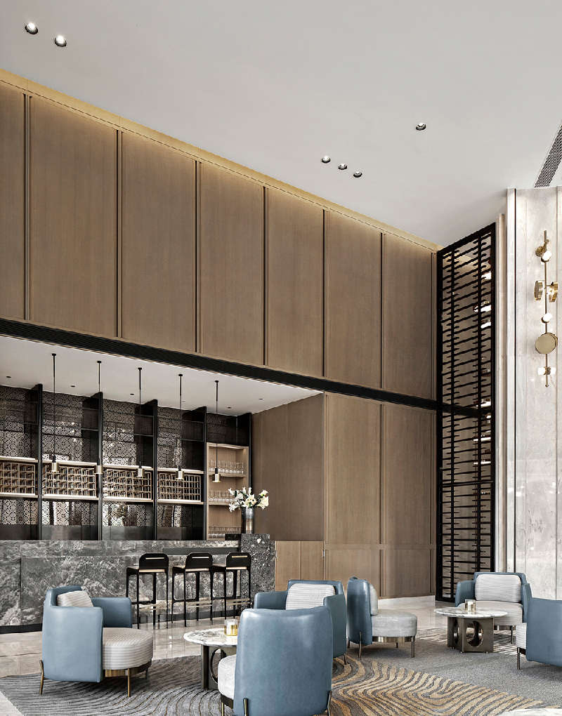酒店大堂的設計著眼於化繁為簡,摒棄以往酒店富麗堂皇的水晶吊燈,采用了更為輕快時尚的設計,成穩大氣的色調給顧客一種回歸本質的自由形態。