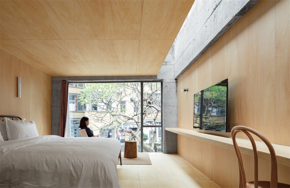 建筑四周圍繞著老式居民樓,為了使其呼應周圍居住環境的氛圍,特意保留了原有立面具有歷史質感的青磚。此外,在外立面的門窗的位置和進深的設計上,結合整個建筑比例和室內布局以數十厘米為單位進行了微調,使得室內視野開敞且采光充足。金屬窗框的更換和進深的加深則為民宿增添了空間浸入感。
