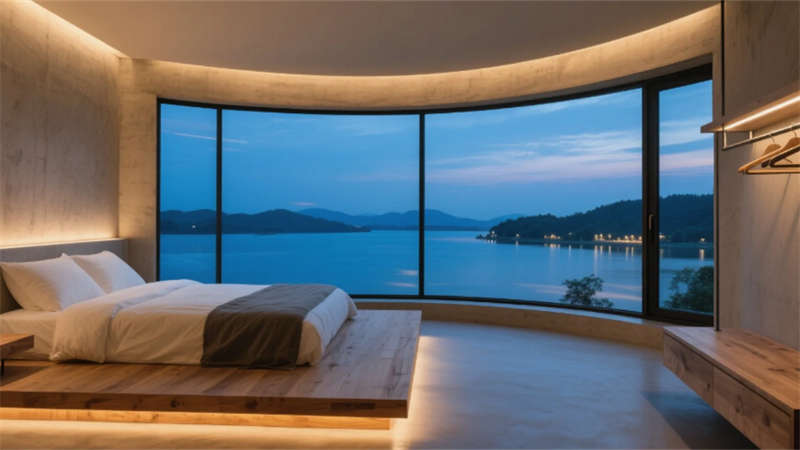 客房設計強調“無界觀景”,全景落地窗收納合肥天際線,懸浮原木地臺床與混凝土浴缸構成侘寂美學。景觀房270°玻璃幕墻將城市燈火化為動態背景,微水泥墻面與亞麻織物撫平喧囂。