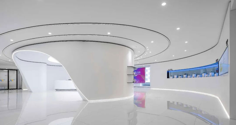 從踏入門廳開始,就劃定了宇宙視界,大廳以天花曲線燈帶統籌整體空間關系,異形包裹的空間內,橢圓形發光燈膜在營造時空感的同時輔助自然光線帶來尤為舒適的光照感為了將空間利用率達到最大。