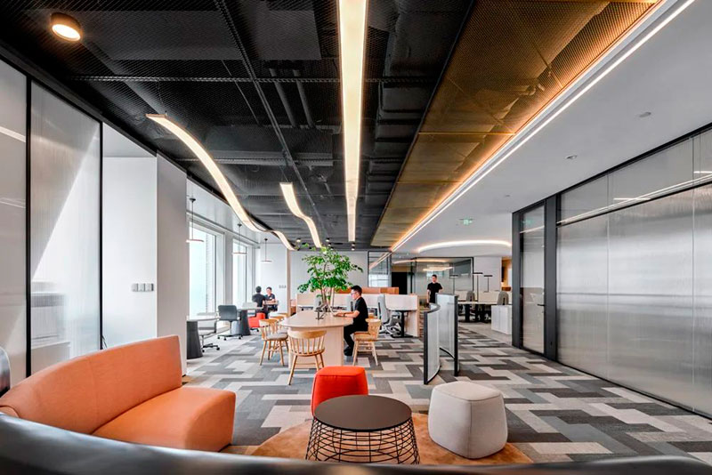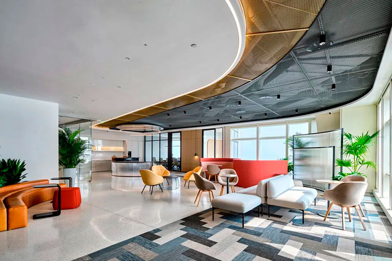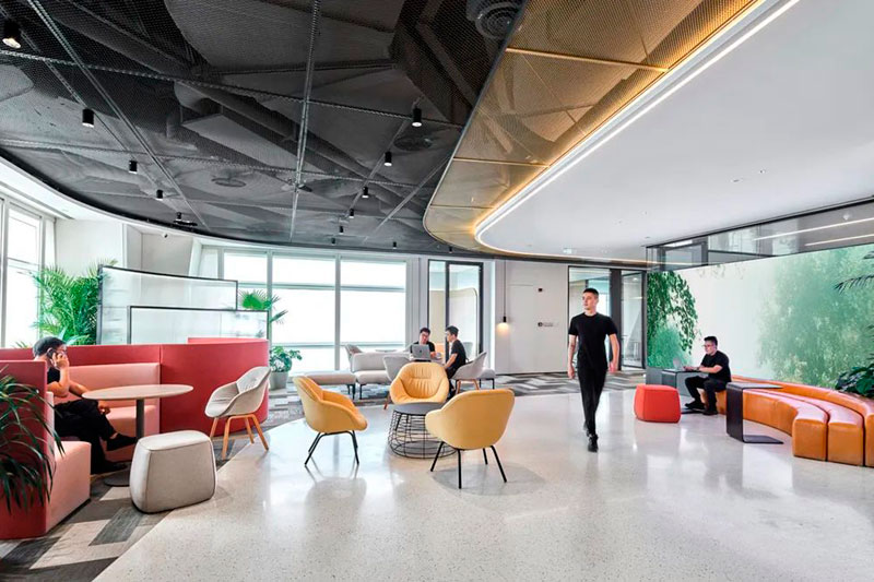 不同于投資公司的傳統形象,設計師以一個圓島吧臺和開敞的自由交流區作為前廳接待場所。大量的自然光涌入室內,明凈開闊。天花地面是圓轉流動的曲線造型,采用水磨石地面、金屬網天花、Bolon塑膠地毯等各種新環保材料,輔以色彩鮮麗的多功能家具組合、大型LED屏和隨處點綴的綠植,呈現出年輕、現代、科技而又充滿能量的生命氣息。