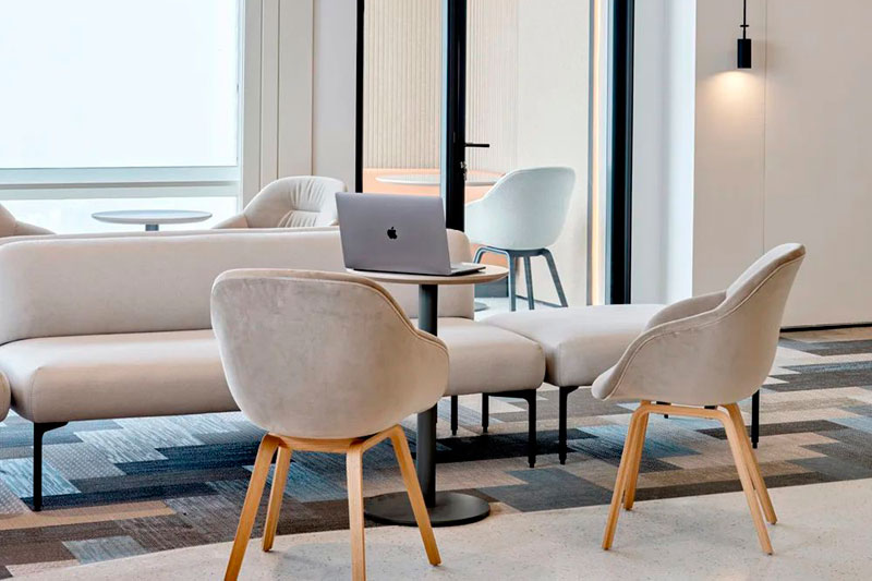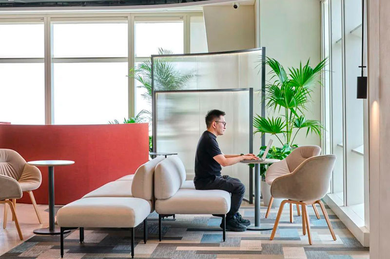 后場辦公區延續了前廳的辦公理念,結合不同功能形式的會議室、電話間,提供了多選擇的工作模式,簡潔而高效。大量可再生面料的墻飾、可回收吸音板和仿生苔蘚的應用,豐滿了視覺層次并極大提升了空間的聲學效果。