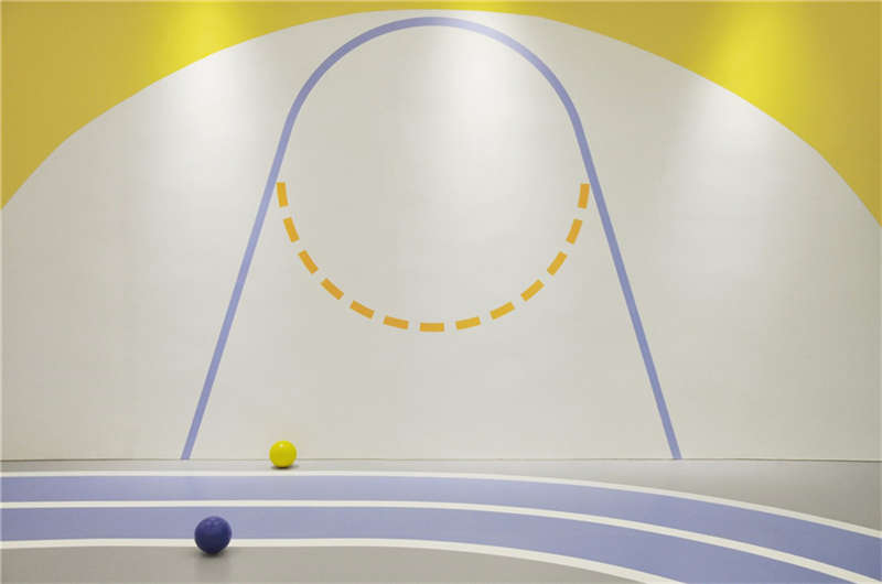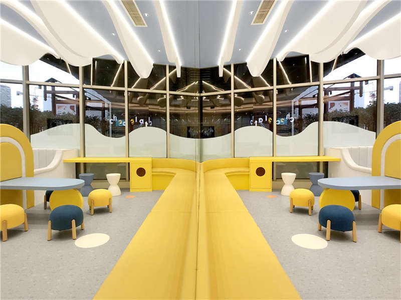 利用樓宇的縱向夾角空間,層層疊出的形象是進入星球的能量加速器。地上的黃色跑道是孩子們丈量自己成長的T臺,每個小朋友通過跑道后都擁有更強的生命力。緊鄰接待區的泡泡池是迎接孩子們的歡樂地,背后的鏡面構筑了游離在現實與夢境之間的界限,折射出孩子更加廣闊的天空,讓能量加倍!