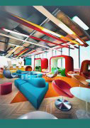 辦公室裝修主題色彩設計,辦公室設計主題就是色彩,長長的彩條作為照明器具縱橫于天花板上,彌補了大面積裸露天花板的空缺,家具色彩的搭配和長長的彩條相呼應,整個辦公空間色彩鮮