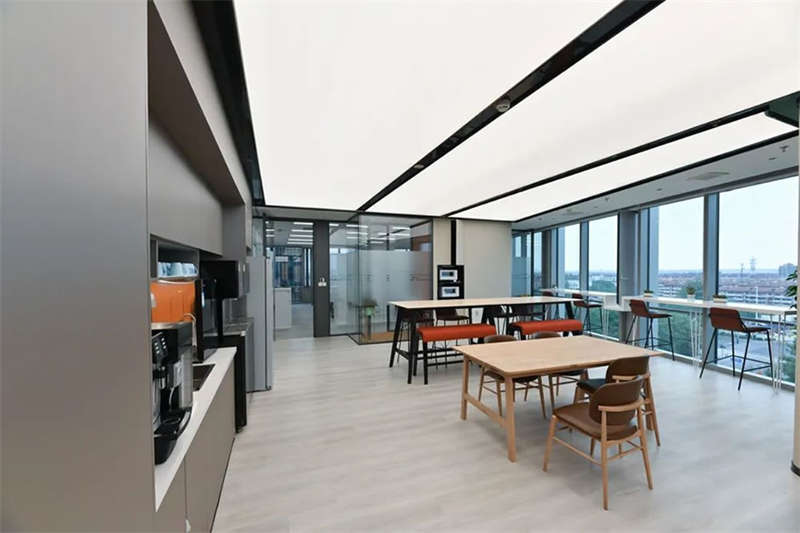 員工區部份選用了電動可調的升降辦公桌,以滿足員工個性化的需求,白灰色的家具搭配,混搭淺木色的休閑洽談區域,地面選用流線款長版的無膠水鋪裝的地毯相呼應。提升了空間品質和美感。