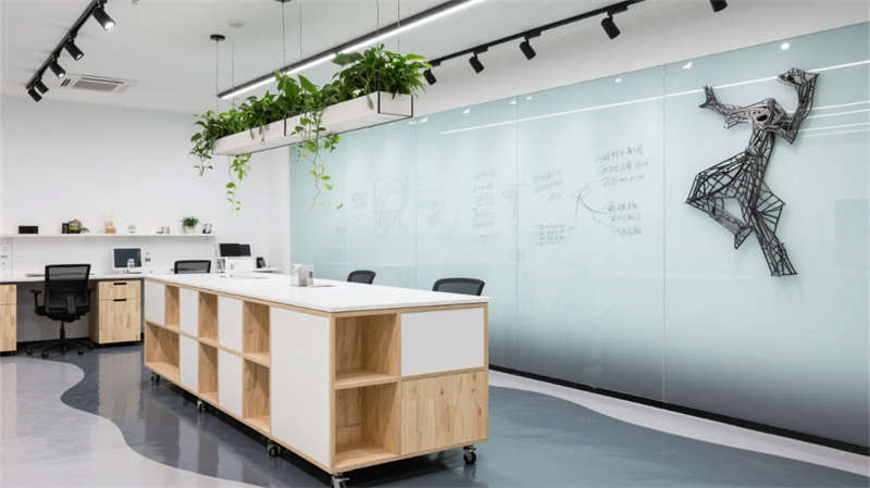 靜音艙與冥想穹頂成為平衡效率的呼吸點:蕪湖鐵畫衍生的藝術裝置、赭山色系漸變墻面與苔蘚微景觀,在科技框架中注入人文溫度。生態茶歇區環形綠植柱呼應窗外垂直花園,模糊自然與空間的界限。