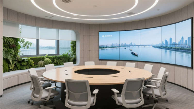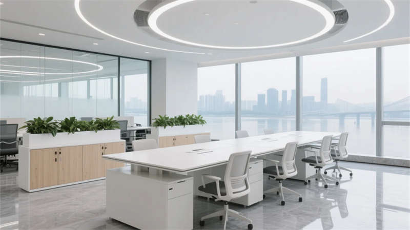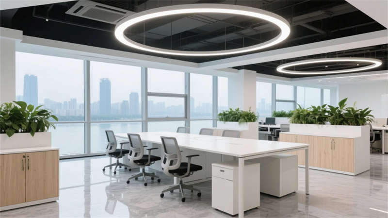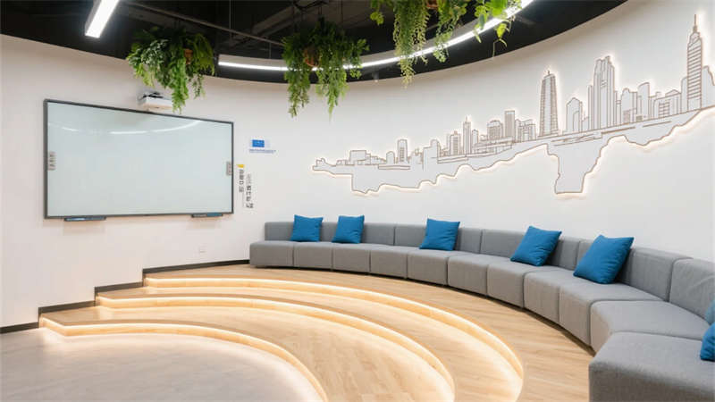開放辦公區以模塊化綠植隔斷柔化邊界,智能會議艙曲面屏動態呈現江岸線,賦予協作以在地詩意。創意實驗室的可書寫玻璃墻與磁吸家具激發即興創造,而階梯沙龍區弧形燈帶如江水蜿蜒,引導思想交匯。