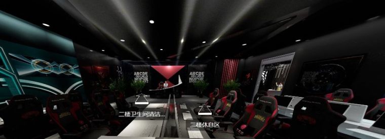 在迎賓區兩邊,左右分布著男賓區和女賓區。相較于普通網咖設計,電競會館具有賽事承辦上的專業特色,為了使人更加有比賽所需專注,男賓區墻面只有簡單的涂鴉,飾物元素也極少,相較于男賓區設計較為簡單,女賓區“紅蜘蛛”主題感十足,頂墻燈光合理搭配來減少黑色來的的壓抑感。男女獨立衛生間分別分布在兩個區域,非常人性化。