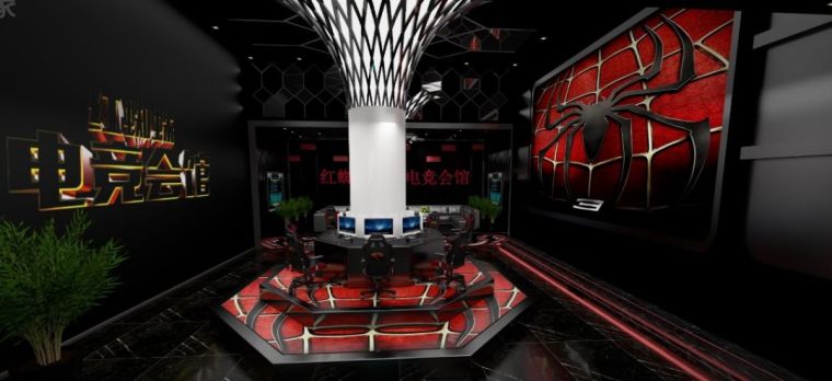 從迎賓區直接進入后,來到最為核心的競技比賽區,滿足電競游戲里開黑等座位聚集需要,非常創意性地在空間中加入了圓柱設計,空間里最大亮點是圓柱臺有規律交錯的線條與“紅蜘蛛”背景墻交相呼應,打造了成為了“蜘蛛網”的元素,讓整個核心空間與主題完美契合。