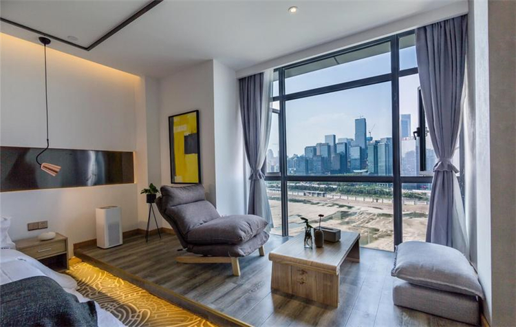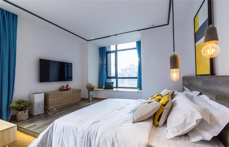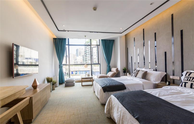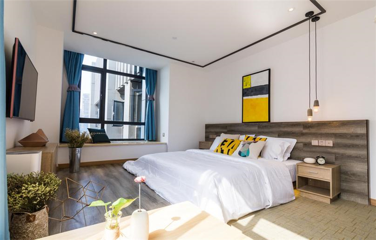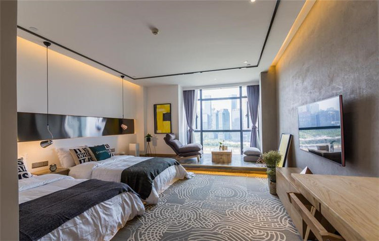 溫馨、小資、賓至如歸是本案設計的一條主線。大面積的墻體刷白,不做墻面大面積包裝,簡簡單單,讓空間更溫馨;配以部分水泥墻面做一個灰色系的穿插,讓空間在白的基礎上得以小范圍的格調提升,配上顏色稍微跳躍的畫及床品,視覺得以輕微的沖擊,不那么刺眼,更多的搭配原木木制品讓人更親近自然,讓客人感覺舒適,如歸家般放松。