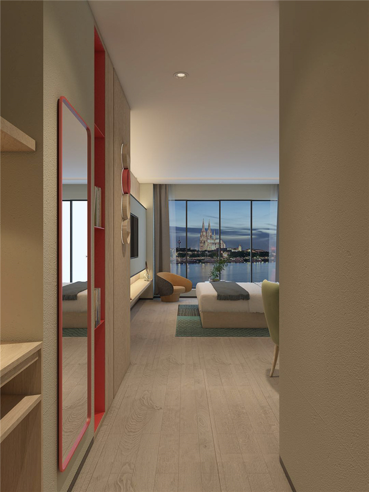 在功能的安排上人性化,為顧客帶來舒適的入住體驗與外立面相呼應,設計師在完整的用材體系上,增加了對比性明顯的色塊,高度提升了空間的趣味性和耐看度。