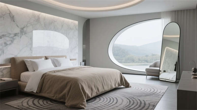 每一處細節皆成藝術現場——走廊夯土墻鐫刻時光肌理,發光地磚指引探索路徑;臥室弧形鏡面折射虛實,讓人沉入湖居夢境。這里不僅是棲居之所,更是一場喚醒感官的在地美學巡禮,讓合肥的湖韻林語,成為流淌于日常的奢享印記。