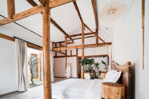 民宿的客房一般都是非標房間,注重溫馨感,一般來說大床房會占80%以上的比例。所有的客房必須開窗,能配置落地窗的盡量配置落地窗,室外風景對房間的價格決定因素很大。因為采用非標服務,所以衛生間可以不拘一格,但一定要舒適。客房的數量不宜為多,小到四五間,最多不要超過15間。